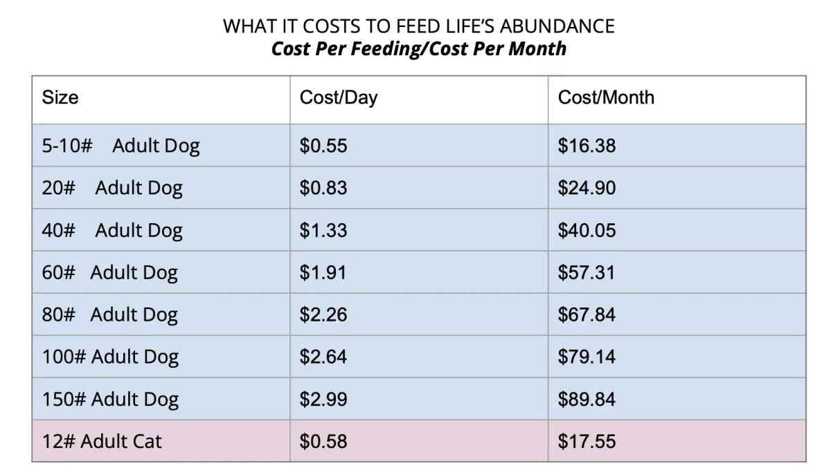 Is Life’s Abundance is affordable? Don’t look at the price per bag — because Life's Abundance is dense nutritionally, you will feed less per day and save money every single month! Using the chart below, see how affordable it is to feed YOUR precious fur-baby the best nutrition there is!